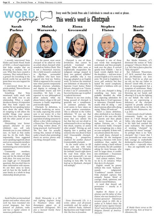 Home Features Word Prompt Word Prompt – CHUTZPAH FeaturesWord PromptSections Word Prompt – CHUTZPAH By Jewish Press Staff - February 11, 2026 0 Share on Facebook Tweet on Twitter tweet Photo Credit: Jewish Press Click on the image below to view a full-page version. Advertisement Share this article on WhatsApp:Advertisement
